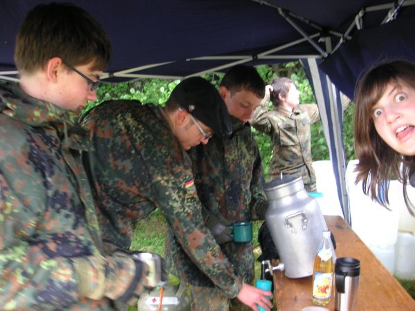 Zu den Trinkpausen kommen dann alle in und zwischen das Küchen- und Mannschaftszelt.